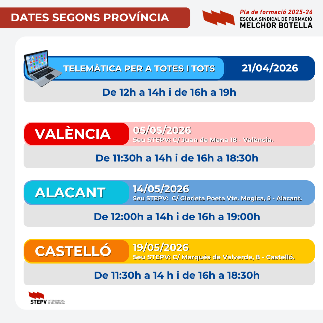 Persones inscrites en València presencialment 5/5/26 de 11:30 a 14 h i de 16 a 18:30 h en seu STEPV en carrer Juan de Mena, 18-baixos